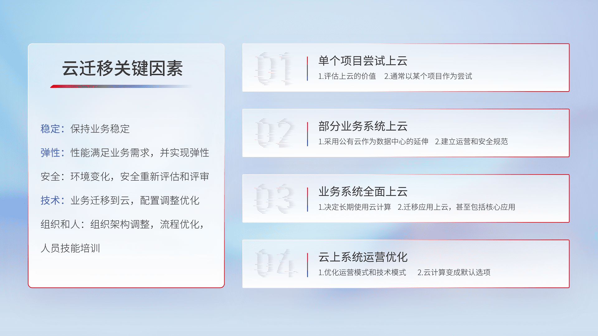 结合实际业务,,,从规划设计、、云平台选型、、、、云原生改造、、、数据迁移、、集成交付,,迁移全过程为客户识别最佳上云路径,,,,做好风险识别管理,,,设计网络架构、、、身份权限、、、安全审计合规、、操作审计、、、、日志审计、、、监控告警策略、、、、多站点容灾设计等,,,对云上基础设施进行整体规划,,,提升IT治理水平,,以满足弹性、、、、高可用、、、高性能的需求。。。。