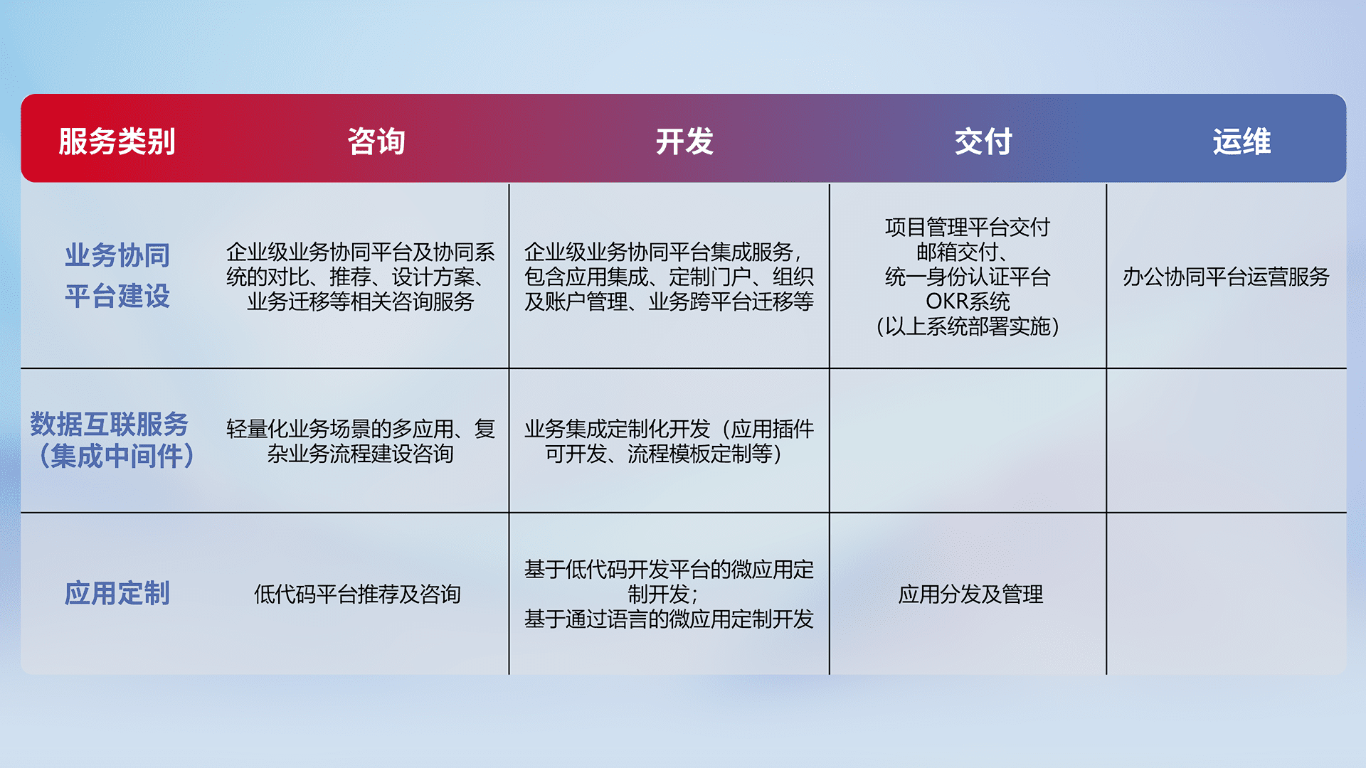针对钉钉、、、企微、、、、IDaas等平台级产品提供产品的规划、、、、方案、、交付、、、、定制化开发等服务,,,实现如统一协同办公、、、智能客户服务、、混合会议管理、、、智能数据查询、、等业务场景,,实现数字化转型。。。